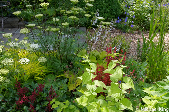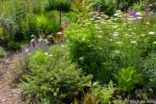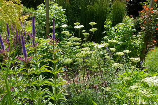 Early summer these borders are at their most colourful and later in the season grasses will rise up to give them a more naturalistic character. At the moment it is the umbellifer Cenolophium denudatum, salvias and early flowering cultivars of veronicastrum that give them their unity by being repeated throughout the schemes.