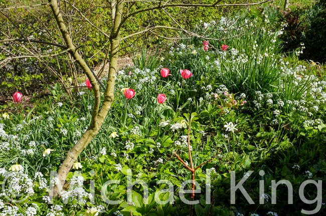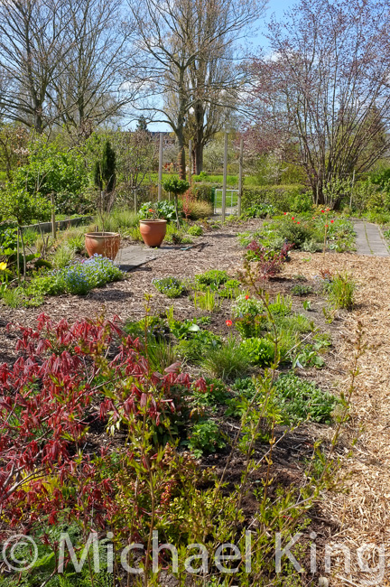 This is a corner planted with a mixed perennial scheme using epimediums, astilbe and euphorbia which all offer exciting spring foliage. I have just added a plant of Berberis thunbergii ‘Orange Rocket’ on the corner to increase the drama. Even without any spring bulbs this is an interesting scheme that has a very long season of interest and as such is an example of the mixing system I am currently using in my perennial meadow schemes. If you would like to engage with me and develop such schemes for yourself then my eBooks or better still my online lecture course at MyGardenSchool is perhaps where you could begin.