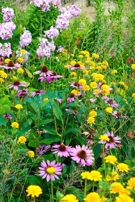 My own ideas for the perennial meadows I now design evolved over may years of struggling within the confines of a small, humble garden. The need for repetition of key plants has to lead to compromises and must result in the use of a restricted pallet of plants. I have learned to create schemes using a small range of key plants, but at the same time leaving room for some extra diversity and freedom. I have also found that by arranging perennial meadows as neat and ordered units within a total garden design that I can introduce some order and formality that is often necessary for gardens that are closely associated with buildings in urban environments.