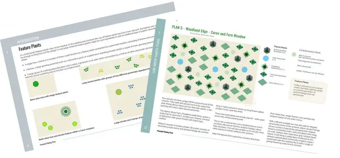 Plans clearly illustrate how the plants should be arranged on the ground using symbols. Sometimes the plants are arranged in groups and in others irregularly or at random. The plans give an insight into how to go about creating naturalistic planting schemes that have a powerful visual impact.