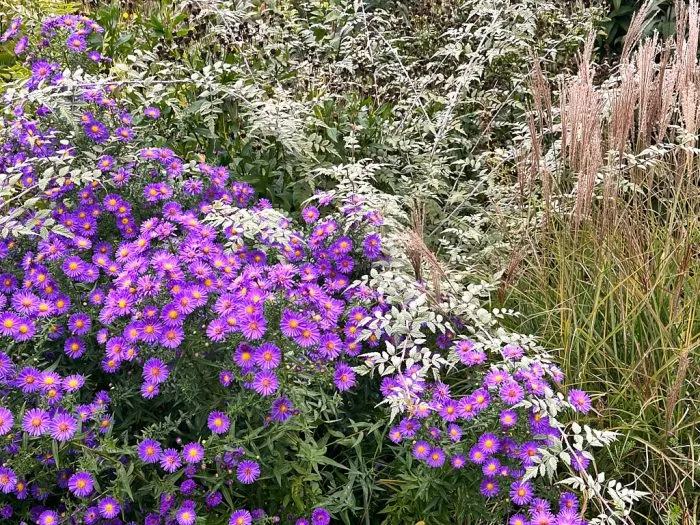 Asters are a key theme plant in my autumn garden. They make excellent planting partners together and especially so with late-flowering, warm season grasses such as the Miscanthus sinensis as seen here. With a dramatic background of Eutrochium purpureum, Silphium, Vernonia and Veronicastrum they can create a colour spectacle at what is traditionally seen as the end of the gardening season. It is not, of course, as all of these plants form distinctive seed heads to carry forward into winter.