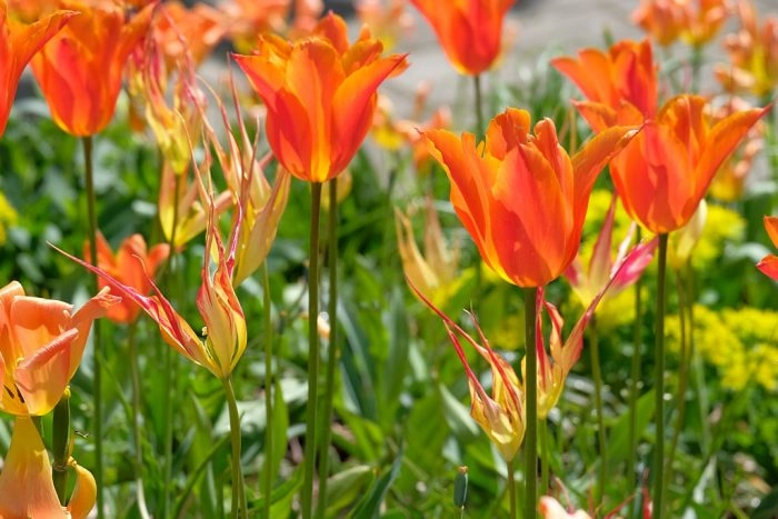 My answer to the wispy nature of Tulipa acuminata has been to combine it with another late flowering tulip, Tulip ‘Ballerina’. Lily flowered tulips such as Ballerina are the modern day equivalent of the needle-shaped tulips of the Ottomans. Their long petals end in a noticeable point. They are elegant, sophisticated tulips to be used alongside early flowering shrubs and perennials in mixed garden borders. These lily flowered tulips have presence and by mixing Tulip ‘Ballerina’ with Tulipa acuminata both get all the attention they deserve.
