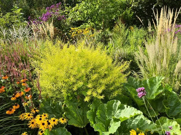 The bright yellow foliage of Spirea thunbergii ‘Ogon’ attracts all of our attention. working well with nearby yellow and orange flowered Helenium cultivars. Later, purple and blue asters will burst into flower nearby for a colourful end of season show.